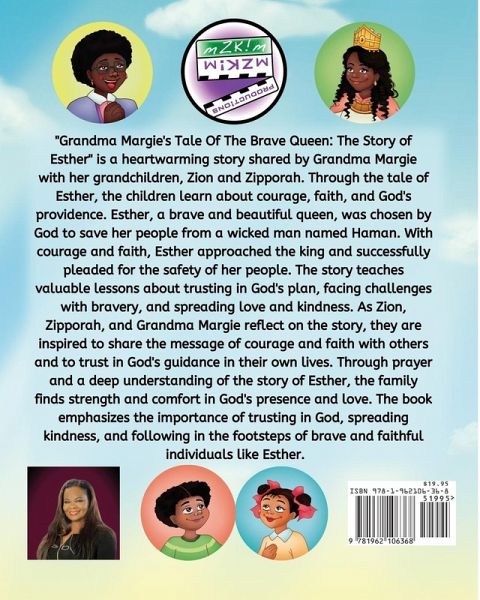 "Grandma Margie's Tale Of The Brave Queen: The Story of Esther" is a heartwarming story shared by Grandma Margie with her grandchildren, Zion and Zipporah. Through the tale of Esther, the children learn about courage, faith, and God's providence. Esther, a brave and beautiful queen, was chosen by God to save her people from a wicked man named Haman. With courage and faith, Esther approached the king and successfully pleaded for the safety of her people. The story teaches valuable lessons about trusting in God's plan, facing challenges with bravery, and spreading love and kindness. As Zion, Zipporah, and Grandma Margie reflect on the story, they are inspired to share the message of courage and faith with others and to trust in God's guidance in their own lives. Through prayer and a deep understanding of the story of Esther, the family finds strength and comfort in God's presence and love. The book emphasizes the importance of trusting in God, spreading kindness, and following in the footsteps of brave and faithful individuals like Esther.