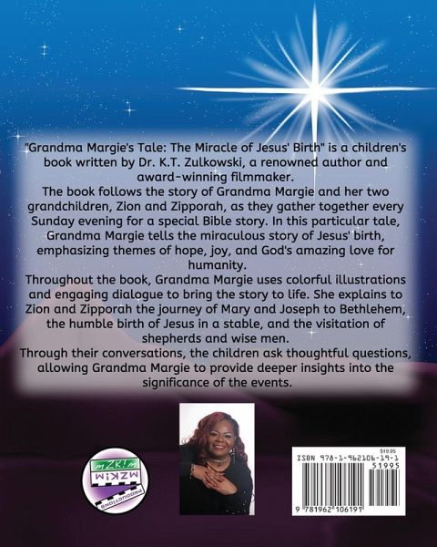 "Grandma Margie's Tale: The Miracle of Jesus' Birth" is a children's book written by Dr. K.T. Zulkowski, a renowned author and award-winning filmmaker. The book follows the story of Grandma Margie and her two grandchildren, Zion and Zipporah, as they gather together every Sunday evening for a special Bible story. In this particular tale, Grandma Margie tells the miraculous story of Jesus' birth, emphasizing themes of hope, joy, and God's amazing love for humanity.Throughout the book, Grandma Margie uses colorful illustrations and engaging dialogue to bring the story to life. She explains to Zion and Zipporah the journey of Mary and Joseph to Bethlehem, the humble birth of Jesus in a stable, and the visitation of shepherds and wise men. Through their conversations, the children ask thoughtful questions, allowing Grandma Margie to provide deeper insights into the significance of the events.