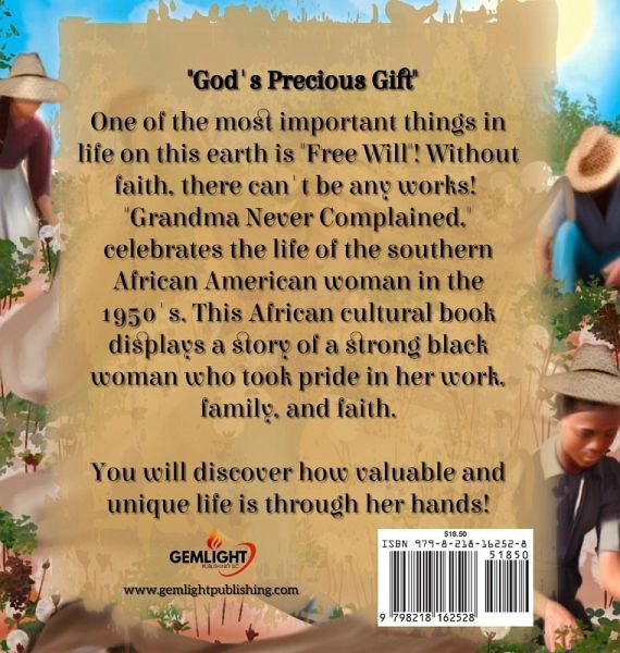 One of the most important things in life on this earth is "Free Will"! Without faith, there can't be any works! "Grandma Never Complained," celebrates the life of the southern African American woman in the 1950's. This African cultural book displays a story of a strong black woman who took pride in her work, family, and faith. You will discover how valuable and unique life is through her hands!