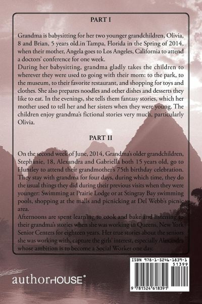 Part I Grandma is babysitting for her two younger grandchildren—Olivia, eight years old, and Brian, five years old—in Tampa, Florida, in the spring of 2014 when their mother, Angela, goes to Los Angeles, California, to attend a doctors’ conference for one week. During her babysitting, Grandma gladly takes the children to wherever they were used to going with their mom: to the park, to the museum, to their favorite restaurant, and to the mall for shopping for toys and clothes. She also prepares noodles and other dishes and desserts they like to eat. In the evenings, she tells them the fantasy stories that her mother used to tell her and her sisters when they were young. The children enjoy Grandma’s fictional stories very much, particularly Olivia. Part II On the second week of June 2014, Grandma’s older grandchildren—Stephanie, eighteen, and Alexandra and Gabriella, both fifteen years old—go to Huntley to attend their grandmother’s seventy-fifth birthday celebration. They stay with Grandma for four days, during which time they do the usual things they did during their previous visits when they were younger: swimming at Prairie Lodge or at Stingray Bay swimming pools, shopping at the malls, and picnicking at Del Webb’s picnic area. Afternoons are spent learning to cook and bake and listening to their grandma’s stories when she was working in Queens, New York, senior centers for eighteen years. Her true stories about the seniors she was working with capture the girls’ interest, especially Alexandra, whose ambition is to become a social worker one day.