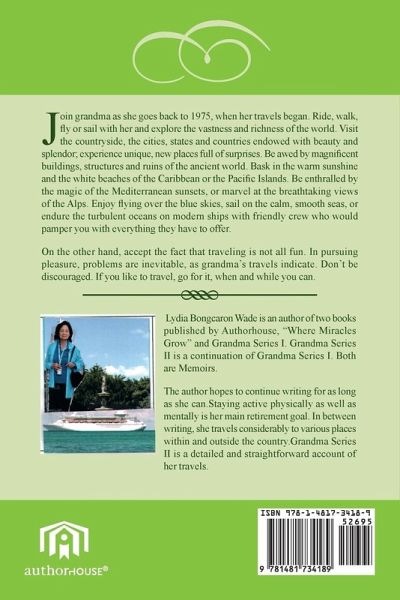 Join grandma as she goes back to 1975, when her travels began. Ride, walk, fly or sail with her and explore the vastness and richness of the world. Visit the countryside, the cities, states and countries endowed with beauty and splendor; experience unique, new places full of surprises. Be awed by magnificent buildings, structures and ruins of the ancient world. Bask in the warm sunshine and the white beaches of the Caribbean or the Pacific Islands. Be enthralled by the magic of the Mediterranean sunsets, or marvel at the breathtaking views of the Alps. Enjoy flying over the blue skies, sail on the calm, smooth seas, or endure the turbulent oceans on modern ships with friendly crew who would pamper you with everything they have to offer. On the other hand, accept the fact that traveling is not all fun. In pursuing pleasure, problems are inevitable, as grandma's travels indicate. Don't be discouraged. If you like to travel, go for it, when and while you can.