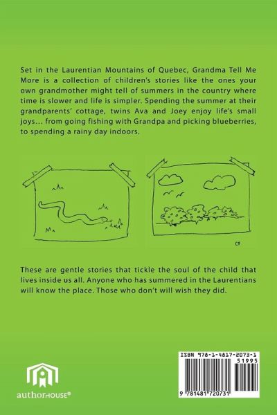 Grandma Tell Me More Set in the Laurentian Mountains of Quebec, Grandma Tell Me More is a collection of stories like the ones your own grandmother might tell of summers in the country where time is slower and life is simpler. The book tells about twins Ava and Joey's summer at their grandparents' cottage... from going fishing with Grandpa, learning to whistle, picking blueberries and baking blueberry buns, to spending a rainy day indoors. Filled with wonderful descriptive detail, you can see the puffs of dust flying behind Grandpa's car as he drives up the country road and smell the sweet scent in the air after a summer storm. These are gentle stories that tickle the soul of the child that lives inside us all. Anyone who has summered in the Laurentians will know the place. Those who don't, will wish they did.