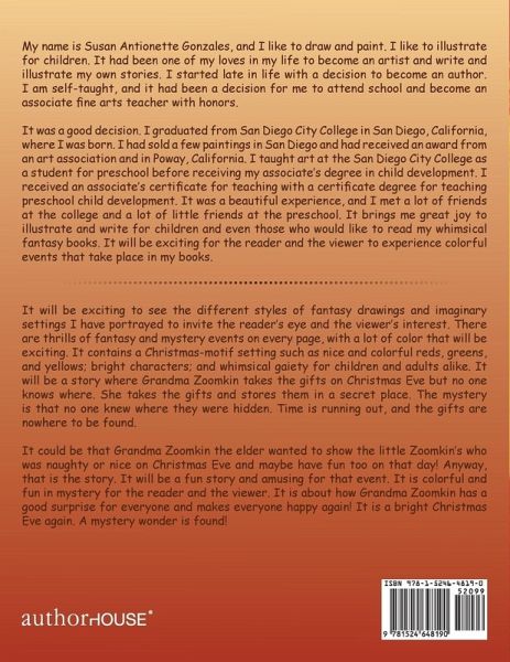 It will be exciting to see the different styles of fantasy drawings and imaginary settings I have portrayed to invite the reader’s eye and the viewer’s interest. There are thrills of fantasy and mystery events on every page, with a lot of color that will be exciting. It contains a Christmas-motif setting such as nice and colorful reds, greens, and yellows; bright characters; and whimsical gaiety for children and adults alike. It will be a story where Grandma Zoomkin takes the gifts on Christmas Eve but no one knows where. She takes the gifts and stores them in a secret place. The mystery is that no one knew where they were hidden. Time is running out, and the gifts are nowhere to be found. It could be that Grandma Zoomkin the elder wanted to show the little Zoomkin’s who was naughty or nice on Christmas Eve and maybe have fun too on that day! Anyway, that is the story. It will be a fun story and amusing for that event. It is colorful and fun in mystery for the reader and the viewer. It is about how Grandma Zoomkin has a good surprise for everyone and makes everyone happy again! It is a bright Christmas Eve again. A mystery wonder is found!