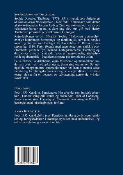"Grandmamas Rejsedagbog 1810" er den 36-årige Sophie Thalbitzers optegnelser over en kombineret forretnings- og familierejse, som hun, hendes mand og 9-årige søn foretager fra København til Berlin i juni-september 1810. Turen foregår med egen hestevogn, sejlskib over Storebælt, gennem Fyn, Jylland, hertugdømmerne, Hamborg og derfra videre ind i Tyskland. Turen er langsommelig, strabadserende og dramatisk - Napoleonskrigene gør forholdene usikre. Selve færden, landskaberne, opholdsstederne og menneskene undervejs beskrives med akkuratesse, åbent sind og humor. Det gør også de mange muntre sammenkomster hos hendes mands tyske familie og forretningsforbindelser og de mange aftener i byernes teatre, alt set fra en begavet og selvstændigt tænkende kvindes synsvinkel.