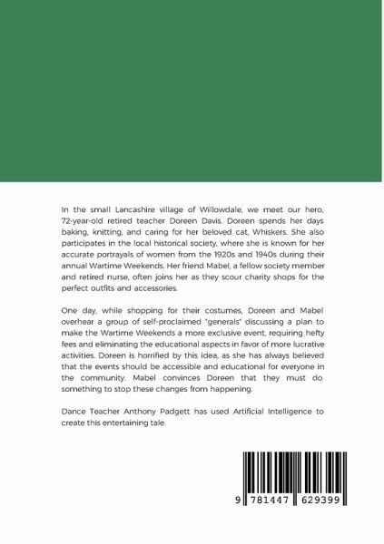 In the small Lancashire village of Willowdale, we meet our hero, 72-year-old retired teacher Doreen Davis. Doreen spends her days baking, knitting, and caring for her beloved cat, Whiskers. She also participates in the local historical society, where she is known for her accurate portrayals of women from the 1920s during their annual Wartime Weekends. Her friend Mabel, a fellow society member and retired nurse, often joins her as they scour charity shops for the perfect outfits and accessories. One day, while shopping for their costumes, Doreen and Mabel overhear a group of self-proclaimed "generals" discussing a plan to make the Wartime Weekends a more exclusive event, requiring hefty fees and eliminating the educational aspects in favor of more lucrative activities. Doreen is horrified by this idea, as she has always believed that the events should be accessible and educational for everyone in the community. Mabel convinces Doreen that they must do something to stop these changes from happening. Vintage Dance Teacher and Artist, Anthony Padgett, has used Artificial Intelligence to create this entertaining tale.