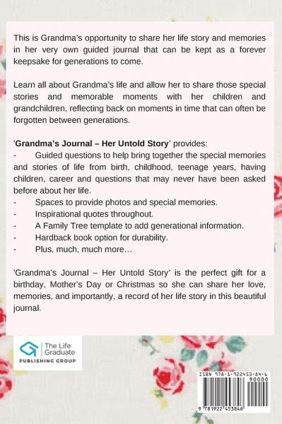 This is Grandma's opportunity to share her life's stories and memories in her very own guided journal that can be kept as a forever keepsake for generations to come. Learn all about Grandma's life and allow her to share those special stories and memorable moments with her children and grandchildren, reflecting back on moments in time that can often be forgotten between generations. 'Grandma's Journal - Her Untold Story' provides: - Guided questions to help bring together the special memories and stories of life from birth, childhood, teenage years, having children, career and questions that may never have been asked before about her life before. - Spaces to provide photos and special memories - Inspirational quotes - A Family Tree template to add generational information - Plus, much, much more... 'Grandma's Journal - Her Untold Story' is the perfect gift so she can share her love, memories, and importantly, a record of her life's story in this beautiful journal.