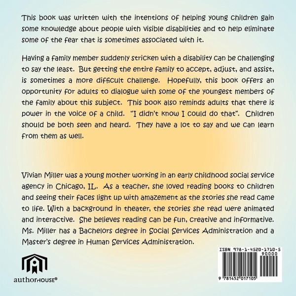 This book was written with the intentions of helping young children gain some knowledge about people with visible disabilities and to help eliminate some of the fear that is sometimes associated with it. Having a family member suddenly stricken with a disability can be challenging to say the least. But getting the entire family to accept, adjust and assist is sometimes a more difficult challenge. Hopefully this book offers an opportunity for adults to dialogue with some of the youngest members of the family about this subject. This book also reminds adults that there is power in the voice of a child, "I didn't know I could do that" Children should be both seen and heard. They have a lot to say and we can learn from them as well.
