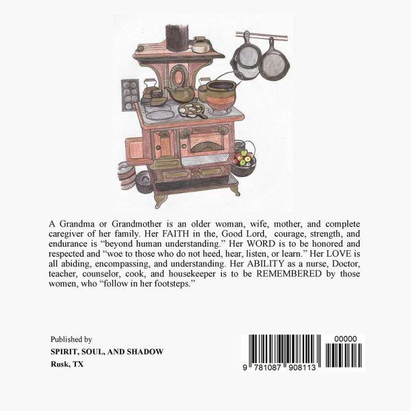A Grandma or Grandmother is an older woman, wife, mother, and complete caregiver of her family. Her FAITH in the, Good Lord, courage, strength, and endurance is "beyond human understanding." Her WORD is to be honored and respected and "woe to those who do not heed, hear, listen, or learn." Her LOVE is all abiding, encompassing, and understanding. Her ABILITY as a nurse, Doctor, teacher, counselor, cook, and housekeeper is to be REMEMBERED by those women, who "follow in her footsteps."