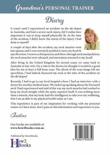 When using the book, Grandma's Personal Trainer, and recording your progress in the Diary or Journal, or using both, it gives you a sense of empowerment. You are no longer leaving your health to chance, you are in control of how you feel, the activities you do and the choices you make. Such a discipline adds to quality of life, wellbeing, personal growth and satisfaction. Christine