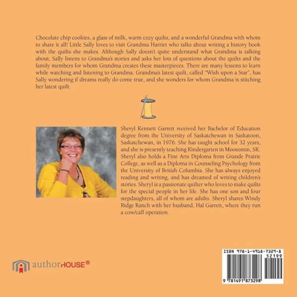 Chocolate chip cookies, a glass of milk, warm cozy quilts, and a wonderful Grandma with whom to share it all! Little Sally loves to visit Grandma Harriet who talks about writing a history book with the quilts she makes. Although Sally doesn't quite understand what Grandma is talking about, Sally listens to Grandma's stories and asks her lots of questions about the quilts and the family members for whom Grandma creates these masterpieces. There are many lessons to learn while watching and listening to Grandma. Grandma's latest quilt, called "Wish upon a Star", has Sally wondering if dreams really do come true, and she wonders for whom Grandma is stitching her latest quilt.
