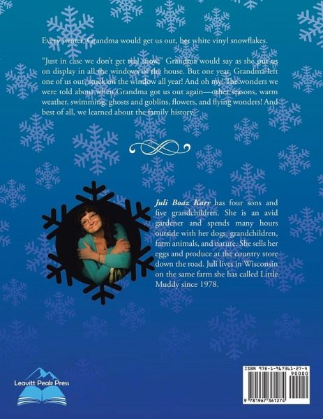 Every Grandma would get us out, her white vinyl snowflakes. "Just in case we don't get real snow," Grandma would say as she put us on display in all the windows of the house. But one year, Grandma left one of us out on the window all year! And oh my! The wonders we were told about when Grandma got us out again-other seasons, warm weather, swimming ghosts and goblins, flowers, and flying wonders! And best of all, we learned about the family history.