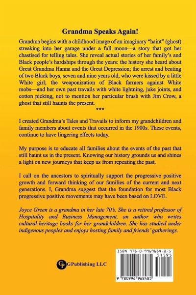 Grandma Speaks Again! Grandma begins with a childhood image of an imaginary "haint" (ghost) streaking into her garage under a full moon-a story that got her chastised for telling tales. She then goes on to reveal actual stories of her family's and Black people's hardships through the years: the history she heard about Great Grandma Hanna and the Great Depression; the arrest and beating of two Black boys, seven and nine years old, who were kissed by a little White girl; the weaponization of Black farmers against White mobs-and her own past travails with white lightning, juke joints, and cotton picking, not to mention her particular brush with Jim Crow, a ghost that still haunts the present.*** I created Grandma's Tales and Travails to inform my grandchildren and family members about events that occurred in the 1900s. These events, which weren't that long ago, have lingering e¿ects today. Escaping death while skirting the Jim Crow laws captures the essence of those times. My purpose is to educate all families about the events of the past that still haunt us in the present. Knowing our history grounds us and shines a light on new journeys that keep us from repeating the past. I call on the ancestors to spiritually support the progressive positive growth and forward thinking of our families of the current and next generations. I, Grandma, state that all forward movements' foundation is LOVE. Joyce Green is a grandma in her late 70's. She is a retired professor of Hospitality and Business Management, an author who writes cultural-heritage books for her grandchildren. She has studied under indigenous peoples and enjoys hosting family and friends' gatherings.