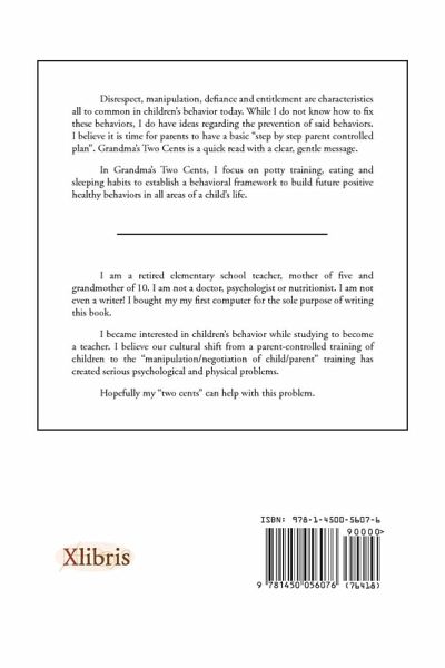 If you have recently spent any amount of time with a group of children, you are aware of the behavior crisis we are experiencing in America's youth. Disrespect, manipulation, rudeness, defiance, and entitlement are characteristics all too common in today's children. I believe it is time for parents to have a basic, tried-and-true, step-by-step behavior plan-not more research, parental manipulation, and quick-fix approaches. While I do not know how to fix this very serious behavior crisis, I do have some ideas regarding the prevention of the behaviors using a parent-controlled approach-starting the day Mom gave birth! I am not a professional writer, but I am a mother, grandmother, and teacher, and I think an advice book written from this perspective would be unique and appreciated. This is a quick read with a clear, positive message. There are no generalizations or theories-just a simple, parent-controlled plan that is gentle and positive. The purpose of this book is to help parents raise happy, polite, and well-adjusted children. In Grandma's Two Cents, I focus on three basic training issues-sleeping, eating, and potty training-to teach a fun, healthy approach that will establish lifelong good habits. This basic training is a framework to build future positive healthy behaviors in all areas of a child's life.