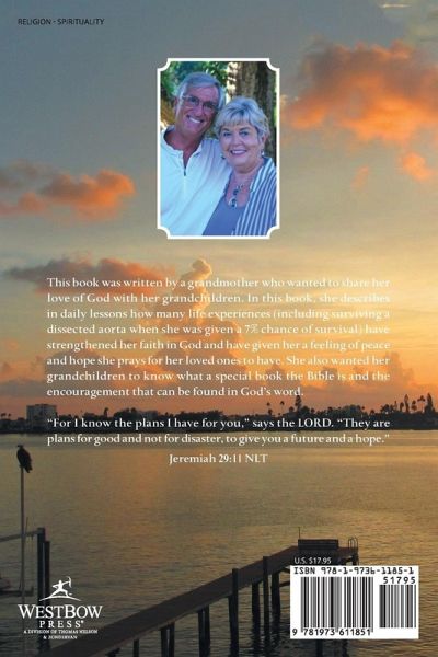 This book was written by a grandmother who wanted to share her love of God with her grandchildren. In this book, she describes in daily lessons how many life experiences (including surviving a dissected aorta when she was given a 7% chance of survival) have strengthened her faith in God and have given her a feeling of peace and hope she prays for her loved ones to have. She also wanted her grandchildren to know what a special book the Bible is and the encouragement that can be found in Gods word. For I know the plans I have for you, says the LORD. They are plans for good and not for disaster, to give you a future and a hope. Jeremiah 29:11 NLT