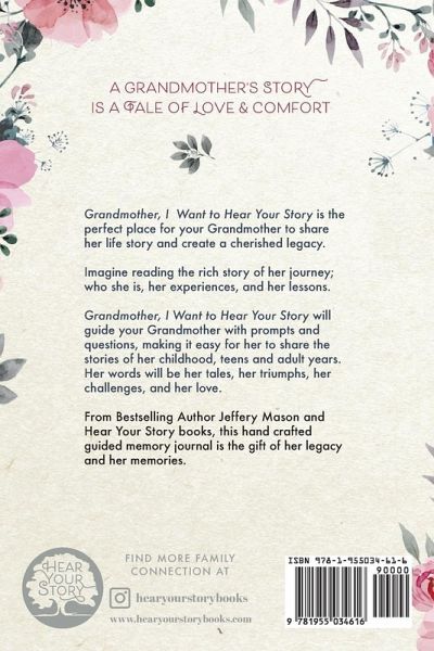 Give Your Grandmother the Gift of Love, Memories, and Legacy. Grandmother, I Want to Hear Your Story is the perfect place for your Grandmother to tell you her special life story while also creating a cherished legacy that you will return to again and again. Imagine reading your Grandmother's words as she shares her journey. Imagine sitting with your children, her grandchildren, and reading her story to them. This is the Original and Best-Selling Way for Your Grandmother to Share Her Life Story Grandmother, I Want to Hear Your Story uses prompts and questions to guide your Grandmother, making it simple for her to tell the stories of her childhood, her teens, and her adult years. This will be her tale, her triumphs, and her challenges. Imagine Reading About the Details of Her Amazing Life and Journey. Bestselling author Jeffrey Mason and Hear Your Story Books have used their years of publishing experience to create this popular series of guided journals. Grandmother, I Want to Hear Your Story has been expertly designed to give your Grandmother a gift she will love while also creating a cherished legacy.Over 250 expertly created guided prompts to make it simple for your Grandmother to share her memories with you. Each question has plenty of room for your Grandma to write and share her life stories. Give your Grandmother the original memory-guided journal. Tens of thousands have been bought for and cherished by families all over the world. 100% designed, created, and printed in the US. Order Grandmother, I Want to Hear Your Story and give your incredible Grandma a forever gift and the gift of legacy.