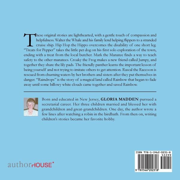 These original stories are lighthearted, with a gentle touch of compassion and helpfulness. Walter the Whale and his family lend helping flippers to a stranded cruise ship. Hip Hop the Hippo overcomes the disability of one short leg. "Treats for Pepper" takes the little pet dog on his first solo exploration of the town, ending with a treat from the local butcher. Mark the Manatee finds a way to teach safety to the other manatees. Croaky the Frog makes a new friend called Jumpy, and together they share the lily pads. The friendly panther learns the important lesson of being yourself and not trying to imitate others to get attention. Rascal the Raccoon is rescued from churning waters by her brothers and sisters after they put themselves in danger. "Raindrops" is the story of a magical land called Rainbow that began to fade away until some billowy white clouds came together and saved Rainbow.