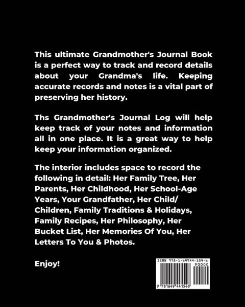 This beautiful Grandmother's Journal is a perfect way for your Grandma to share her story with her grandchildren and children about her life. She definitely has a lifetime of memories & experiences to contribute and record. Don't let her stories go untold! The interior of this book has many prompts and questions with blank lined space for her to fill in and write. The sections include questions about: Her Family Tree Her Parents (Your Great-grandparents) Her Childhood Her School Age Years Your Grandfather (Grandpa) Her Child/Children (Your Mother or Father, Mom or Dad) Family Traditions and Holidays Family Recipes Her Philosophy On Life and Words of Wisdom Her Bucket List Her Memories and Thoughts of You As a Baby/Child Her Letters To You Photos This is an amazing and unique way to show your appreciation for her and show her that you care enough to want to hear her thoughts, notes, and personal memories. Will also make a great way to pass down this family heirloom. Plenty of space to glue or tape pictures from over the years. Makes great birthday and Christmas gifts for your Nana. Designed with the modern Grandmother in mind. Journals can be a great way to keep all her information organized and all in one place. Grab one now! Size is 8x10 inches, 98 pages, white paper, black ink, soft matte finish cover, paperback.