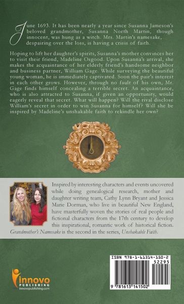 ABOUT THE BOOK: June 1693. It has been nearly a year since Susanna Jameson's beloved grandmother, Susanna North Martin, though innocent, was hung as a witch. Mrs. Martin's namesake, despairing over the loss, is having a crisis of faith. Hoping to lift her daughter's spirits, Susanna's mother convinces her to visit their friend, Madeline Osgood. Upon Susanna's arrival, she makes the acquaintance of her elderly friend's handsome neighbor and business partner, William Gage. While surveying the beautiful, young woman, he is immediately captivated. Soon the pair's interest in each other grows. However, through no fault of his own, Mr. Gage finds himself concealing a terrible secret. An acquaintance, who is also attracted to Susanna, if given an opportunity, would eagerly reveal that secret. What will happen? Will the rival disclose William's secret in order to win Susanna for himself? What is more, will she be inspired by Madeline's unshakable faith to rekindle her own? **** ABOUT THE AUTHORS: Inspired by interesting characters and events uncovered while doing genealogical research, mother and daughter writing team, Cathy Lynn Bryant and Jessica Marie Dorman, who live in beautiful New England, have masterfully woven the stories of real people and fictional characters from the 17th century to develop this inspirational, romantic work of historical fiction. Grandmother's Namesake is the second book in the Unshakable Faith series, with the third book to be completed in 2013.