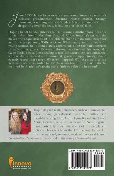 ABOUT THE BOOK: June 1693. It has been nearly a year since Susanna Jameson's beloved grandmother, Susanna North Martin, though innocent, was hung as a witch. Mrs. Martin's namesake, despairing over the loss, is having a crisis of faith. Hoping to lift her daughter's spirits, Susanna's mother convinces her to visit their friend, Madeline Osgood. Upon Susanna's arrival, she makes the acquaintance of her elderly friend's handsome neighbor and business partner, William Gage. While surveying the beautiful, young woman, he is immediately captivated. Soon the pair's interest in each other grows. However, through no fault of his own, Mr. Gage finds himself concealing a terrible secret. An acquaintance, who is also attracted to Susanna, if given an opportunity, would eagerly reveal that secret. What will happen? Will the rival disclose William's secret in order to win Susanna for himself? What is more, will she be inspired by Madeline's unshakable faith to rekindle her own? **** ABOUT THE AUTHORS: Inspired by interesting characters and events uncovered while doing genealogical research, mother and daughter writing team, Cathy Lynn Bryant and Jessica Marie Dorman, who live in beautiful New England, have masterfully woven the stories of real people and fictional characters from the 17th century to develop this inspirational, romantic work of historical fiction. Grandmother's Namesake is the second book in the Unshakable Faith series, with the third book to be completed in 2013.