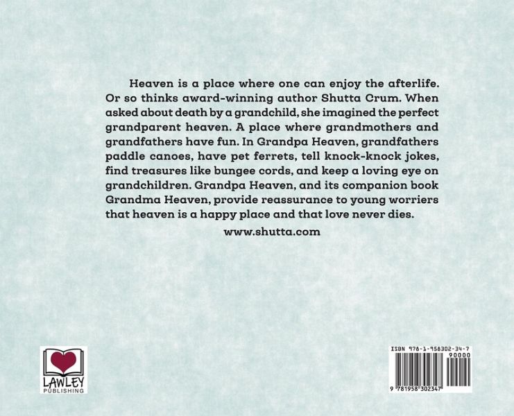Heaven is a place where one can enjoy the afterlife. Or so thinks award-winning author Shutta Crum. When asked about death by a grandchild, she imagined the perfect grandparent heaven. A place where grandmothers and grandfathers have fun. In Grandpa Heaven, grandfathers paddle canoes, have pet ferrets, tell knock-knock jokes, find treasures like bungee cords, and keep a loving eye on grandchildren. Grandpa Heaven, and its companion book Grandma Heaven, provide reassurance to young worriers that heaven is a happy place and that love never dies.