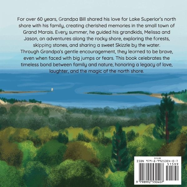 For over 60 years, Grandpa Bill shared his love for Lake Superior's north shore with his family, creating cherished memories in the small town of Grand Marais. Every summer, he guided his grandkids, Melissa and Jason, on adventures along the rocky shore, exploring the forests, skipping stones, and sharing a sweet Skizzle by the water. Through Grandpa's gentle encouragement, they learned to be brave, even when faced with big jumps or fears. This book celebrates the timeless bond between family and nature, honoring a legacy of love, laughter, and the magic of the North Shore.