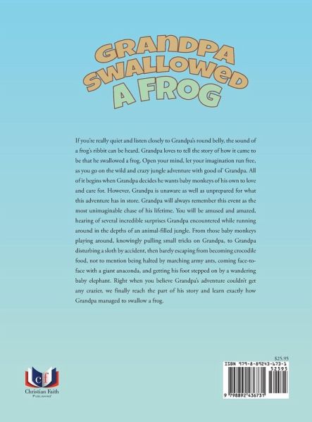 If you're really quiet and listen closely to Grandpa's round belly, the sound of a frog's ribbit can be heard. Grandpa loves to tell the story of how it came to be that he swallowed a frog. Open your mind, let your imagination run free, as you go on the wild and crazy jungle adventure with good ol' Grandpa. All of it begins when Grandpa decides he wants baby monkeys of his own to love and care for. However, Grandpa is unaware as well as unprepared for what this adventure has in store. Grandpa will always remember this event as the most unimaginable chase of his lifetime. You will be amused and amazed, hearing of several incredible surprises Grandpa encountered while running around in the depths of an animal-filled jungle. From those baby monkeys playing around, knowingly pulling small tricks on Grandpa, to Grandpa disturbing a sloth by accident, then barely escaping from becoming crocodile food, not to mention being halted by marching army ants, coming face-to-face with a giant anaconda, and getting his foot stepped on by a wandering baby elephant. Right when you believe Grandpa's adventure couldn't get any crazier, we finally reach the part of his story and learn exactly how Grandpa managed to swallow a frog.