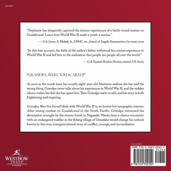 "Stephanie has eloquently captured the intense experiences of a battle-tested marine on Guadalcanal. Learn how World War II made a youth a marine." - Col. James A. Blakely Jr., USMC ret., friend of Angelo Sammartino for many years "In this true account, the faith of the author's father withstood his combat experience in World War II and led him to the realization that people are people all over the world." - Col. Samuel Boykin Hunter, retired, US Army "Grandpa, were you scared?" As soon as the words leave her mouth, eight-year-old Marianne realizes she has said the wrong thing. Grandpa never talks about his experiences in World War II, and the sudden silence makes her feel she has upset him. Then Grandpa starts to talk, and his story is both frightening and inspiring. Grandpa, Were You Scared? deals with World War II in an honest but nongraphic manner. After seeing combat on Guadalcanal in the South Pacific, Grandpa witnessed the devastation wrought by the atomic bomb in Nagasaki. Weeks later, a chance encounter with an endangered toddler in the fishing village of Omadaka would change his outlook forever in this true, intergenerational story of conflict, courage, and reconciliation.