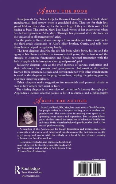 Chapter One My Grandson's Life and Death describes the joy felt from the birth and life of a beloved grandchild, and the agony of his illness and death at two-and-a-half years. Chapter Two Our Family's Grief tells of the grief, confusion, anger and family's struggle to continue functioning following a grandchild's death. Chapter Three My Search For Help documents the author's frustration with the lack of applicable information for grandparents' grief. Chapter Four The Grief Process summarizes theories of various authorities about grief and how relevant they are for parents and grandparents. Chapter Five Helping Myself presents information the author learned from experience, study, and correspondence with other grandparents. Chapter Six Helping Our Grieving Child suggests the needs of, and various methods of helping the grieving parent, child of the grandparent. Chapter Seven Sibling's Grief and Needs discusses the multiple and diverse needs of, and how to help a family's surviving children. Chapter Eight In Memory: Memorials and Healing Rituals offers suggestions and examples of memorials and personal rituals. Chapter Nine How Others May Help/Hinder gives examples and ideas of how those surrounding a grieving family may assist or harm. Chapter Ten Finding My Way summarizes the author's travel through, learning from, and the outcome of her grief journey. Epilogue Appendix I: Selected Poems Appendix II: Resources Bibliography Index
