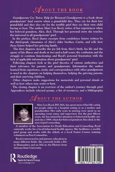 "Grandparents Cry Twice: Help for Bereaved Grandparents" is a book about grandparents' dual sorrow when a grandchild dies. They cry for their lost grandchild and they also cry for the terrible grief they see their own child having to bear. The author, Mary Lou Reed, writes of her experiences when her beloved grandson, Alex, died. Through her personal story she touches the universal in all grandparents' grief.