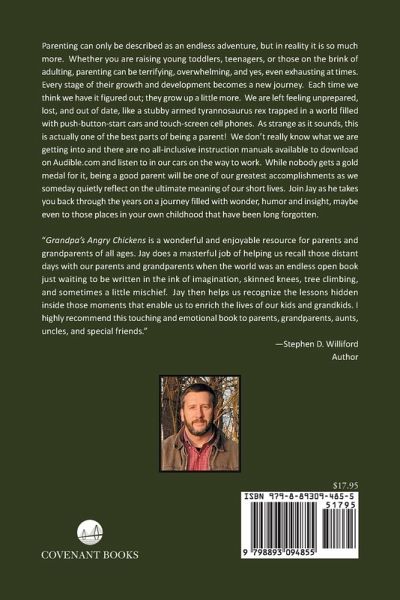 Parenting can only be described as an endless adventure, but in reality it is so much more. Whether you are raising young toddlers, teenagers, or those on the brink of adulting, parenting can be terrifying, overwhelming, and yes, even exhausting at times. Every stage of their growth and development becomes a new journey. Each time we think we have it figured out; they grow up a little more. We are left feeling unprepared, lost, and out of date, like a stubby armed tyrannosaurus rex trapped in a world filled with push-button-start cars and touch-screen cell phones. As strange as it sounds, this is actually one of the best parts of being a parent! We don't really know what we are getting into and there are no all-inclusive instruction manuals available to download on Audible.com and listen to in our cars on the way to work. While nobody gets a gold medal for it, being a good parent will be one of our greatest accomplishments as we someday quietly reflect on the ultimate meaning of our short lives. Join Jay as he takes you back through the years on a journey filled with wonder, humor and insight, maybe even to those places in your own childhood that have been long forgotten. "Grandpa's Angry Chickens is a wonderful and enjoyable resource for parents and grandparents of all ages. Jay does a masterful job of helping us recall those distant days with our parents and grandparents when the world was an endless open book just waiting to be written in the ink of imagination, skinned knees, tree climbing, and sometimes a little mischief. Jay then helps us recognize the lessons hidden inside those moments that enable us to enrich the lives of our kids and grandkids. I highly recommend this touching and emotional book to parents, grandparents, aunts, uncles, and special friends." Stephen D. Williford Author