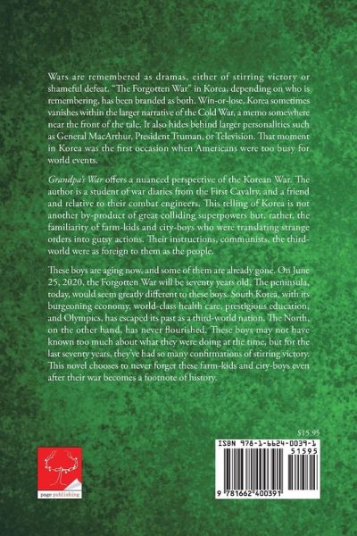 Wars are remembered as dramas, either of stirring victory or shameful defeat. "The Forgotten War" in Korea, depending on who is remembering, has been branded as both. Win-or-lose, Korea sometimes vanishes within the larger narrative of the Cold War, a memo somewhere near the front of the tale. It also hides behind larger personalities such as General MacArthur, President Truman, or Television. That moment in Korea was the first occasion when Americans were too busy for world events. Grandpa's War offers a nuanced perspective of the Korean War. The author is a student of war diaries from the First Cavalry, and a friend and relative to their combat engineers. This telling of Korea is not another by-product of great colliding superpowers but, rather, the familiarity of farm-kids and city-boys who were translating strange orders into gutsy actions. Their instructions, communists, the third-world were as foreign to them as the people. These boys are aging now, and some of them are already gone. On June 25, 2020, the Forgotten War will be seventy years old. The peninsula, today, would seem greatly different to these boys. South Korea, with its burgeoning economy, world-class health care, prestigious education, and Olympics, has escaped its past as a third-world nation. The North, on the other hand, has never flourished. These boys may not have known too much about what they were doing at the time, but for the last seventy years, they've had so many confirmations of stirring victory. This novel chooses to never forget these farm-kids and city-boys even after their war becomes a footnote of history.