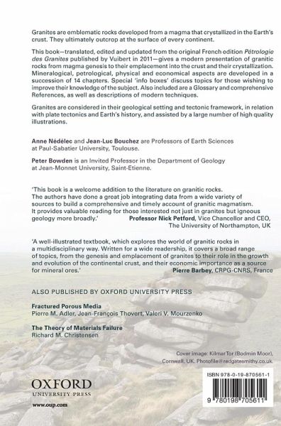 Granites are emblematic rocks developed from a magma that crystallized in the Earth's crust. They ultimately outcrop at the surface of every continent. This book - translated, edited, and updated from the original French edition Pétrologie des Granites published by Vuibert in 2011 - gives a modern presentation of granitic rocks, or granites, from magma genesis to their emplacement into the crust and their crystallization. Mineralogical, petrological, physical, and economical aspects are developed in a succession of 14 chapters. Special 'info boxes' discuss topics for those wishing to deepen their knowledge of the subject. Also included is a glossary, a comprehensive bibliography, as well as descriptions of modern techniques. Granites are considered in their geological spatial and temporal frame, in relation with Plate Tectonics and Earth History, and assisted by a large number of high quality illustrations.