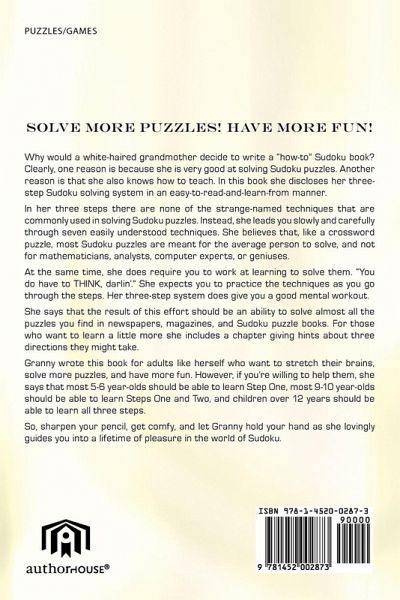 SOLVE MORE PUZZLES! HAVE MORE FUN! Why would a white-haired grandmother decide to write a "how-to" Sudoku book? Clearly, one reason is because she is very good at solving Sudoku puzzles. Another good reason is that she also knows how to teach. In this book she discloses her three-step Sudoku solving system in an easy-to-read-and-learn-from manner. In her three steps there are none of the strange-named techniques that are commonly used in solving Sudoku puzzles. Instead she leads you slowly and carefully through seven easily understood techniques. She believes that, like a good crossword puzzle, most Sudoku puzzles are meant for the average person to solve and not for mathematicians, analysts, computer experts, or geniuses. At the same time, she does require you to work at learning to solve them. "You do have to THINK, darlin'." She expects you to practice the techniques as you go through the steps. Her three-step system does give you a good mental workout. She says that the result of this effort should be an ability to solve almost all the puzzles you find in newspapers, magazines, and Sudoku puzzle books. For those who want to learn a little more she includes a chapter giving hints about three directions they might take. Granny wrote this book for adults like herself who want to stretch their brains, solve more puzzles, and have more fun. However, if you're willing to help them, she says that most 5-6 year-olds should be able to learn Step One, most 9-10 year-olds should be able to learn Steps One and Two, and children over 12 years should be able to learn all three steps. So, sharpen your pencil, get comfy, and let Granny hold your hand as she lovingly guides you into a lifetime of pleasure in the world of Sudoku.