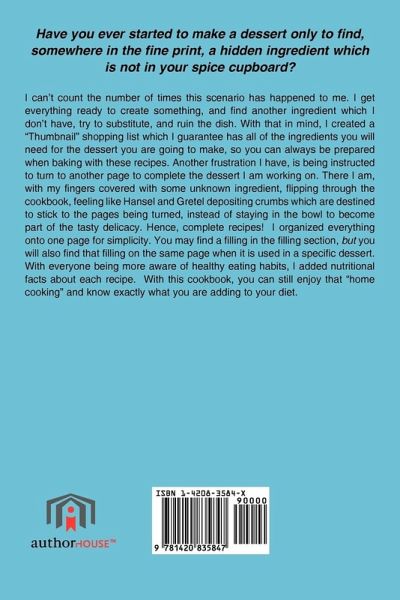 Have you ever started to make a dessert only to find, somewhere in the fine print, a hidden ingredient which is not in your spice cupboard? I can't count the number of times this scenario has happened to me. I get everything ready to create something, and find another ingredient which I don't have, try to substitute, and ruin the dish. With that in mind, I created a "Thumbnail" shopping list which I guarantee has all of the ingredients you will need for the dessert you are going to make, so you can always be prepared when baking with these recipes. Another frustration I have, is being instructed to turn to another page to complete the dessert I am working on. There I am, with my fingers covered with some unknown ingredient, flipping through the cookbook, feeling like Hansel and Gretel depositing crumbs which are destined to stick to the pages being turned, instead of staying in the bowl to become part of the tasty delicacy. Hence, complete recipes! I organized everything onto one page for simplicity. You may find a filling in the filling section, but you will also find that filling on the same page when it is used in a specific dessert. With everyone being more aware of healthy eating habits, I added nutritional facts about each recipe. With this cookbook, you can still enjoy that "home cooking" and know exactly what you are adding to your diet.