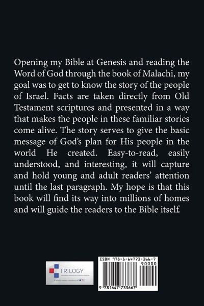 Opening my Bible at Genesis and reading the Word of God through the book of Malachi, my goal was to get to know the story of the people of Israel. Facts are taken directly from the Old Testament scriptures and presented in a way that makes the people in these familiar stories come alive. The story serves to give the basic message of God's plan for His people in the world He created. Easy-to-read, easily understood, and interesting, it will capture and hold young and adult readers' attention until the last paragraph. My hope is that this book will find its way into millions of homes and will guide the readers to the Bible itself.