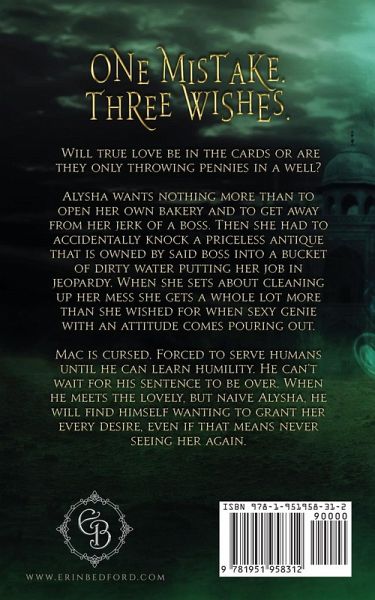 One mistake. Three wishes. Will true love be in the cards or are they only throwing pennies in a well? Alysha wants nothing more than to open her own bakery and to get away from her jerk of a boss. Then she had to accidentally knock a priceless antique that is owned by said boss into a bucket of dirty water putting her job in jeopardy. When she sets about cleaning up her mess she gets a whole lot more than she wished for when sexy genie with an attitude comes pouring out. Mac is cursed. Forced to serve humans until he can learn humility. He can't wait for his sentence to be over. When he meets the lovely, but naive Alysha, he will find himself wanting to grant her every desire, even if that means never seeing her again.