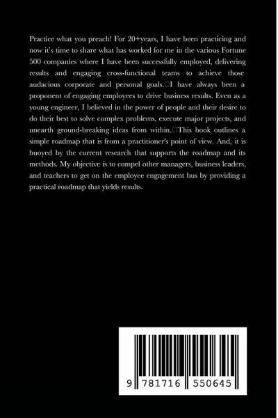 Practice what you preach! For 20+years, I have been practicing and now it's time to share what has worked for me in the various Fortune 500 companies where I have been successfully employed, delivering results and engaging cross-functional teams to achieve those audacious corporate and personal goals. I have always been a proponent of engaging employees to drive business results. Even as a young engineer, I believed in the power of people and their desire to do their best to solve complex problems, execute major projects, and unearth ground-breaking ideas from within. This book outlines a simple roadmap that is from a practitioner's point of view. And, it is buoyed by the current research that supports the roadmap and its methods. My objective is to compel other managers, business leaders, and teachers to get on the employee engagement bus by providing a practical roadmap that yields results.