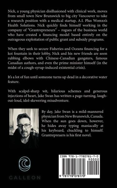 Nick, a young physician disillusioned with clinical work, moves from small province New Brunswick to big city Vancouver to take a research position with a medical startup, A.I. Plus Womxn's Health Solutions. Nick quickly finds himself working in the company of "Grantrepreneurs" - rogues of the business world who have created a financing model based entirely on the outrageous exploitation of public grant and subsidy programs. When they seek to secure Fisheries and Oceans financing for a koi fountain in their lobby, Nick and his new friends rub elbows with Chinese-Canadian gangsters, famous Canadian authors, and even the prime minister himself (in the midst of a cough-syrup-induced existential crisis). It's a lot of fun until someone shows up dead in a decorative water feature. With scalpel-sharp wit, hilarious schemes and generous injections of heart, Jake Swan has written a page-turning, laugh-out-loud, idol-skewering misadventure.