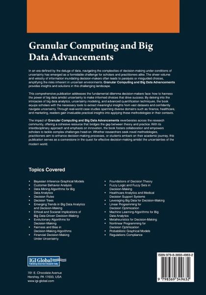 In an era defined by the deluge of data, navigating the complexities of decision-making under conditions of uncertainty has emerged as a formidable challenge for scholars and practitioners alike. The sheer volume and velocity of information inundating decision-makers often leads to paralysis or misguided choices, amplifying the risks inherent in uncertain environments. Granular Computing and Big Data Advancements provides insights and solutions in this challenging landscape. The impact of Granular Computing and Big Data Advancements reverberates across the research community, offering a cohesive resource that bridges the gap between theory and practice. With its interdisciplinary approach and emphasis on innovation, the book fosters collaboration and empowers scholars to tackle complex challenges head-on. Whether researchers seek novel methodologies, practitioners aim to enhance decision-making processes, or students embark on their academic journey, this publication serves as a cornerstone in the quest for effective decision-making amidst the uncertainties of the modern world.