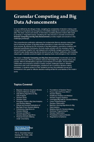 In an era defined by the deluge of data, navigating the complexities of decision-making under conditions of uncertainty has emerged as a formidable challenge for scholars and practitioners alike. The sheer volume and velocity of information inundating decision-makers often leads to paralysis or misguided choices, amplifying the risks inherent in uncertain environments. Granular Computing and Big Data Advancements provides insights and solutions in this challenging landscape. The impact of Granular Computing and Big Data Advancements reverberates across the research community, offering a cohesive resource that bridges the gap between theory and practice. With its interdisciplinary approach and emphasis on innovation, the book fosters collaboration and empowers scholars to tackle complex challenges head-on. Whether researchers seek novel methodologies, practitioners aim to enhance decision-making processes, or students embark on their academic journey, this publication serves as a cornerstone in the quest for effective decision-making amidst the uncertainties of the modern world.