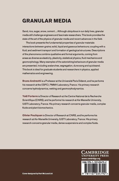 Sand, rice, sugar, snow, cement... Although ubiquitous in our daily lives, granular media still challenge engineers and fascinate researchers. This book provides the state-of-the-art of the physics of granular media and recent advances in the field. The book presents the fundamental properties of granular materials: interactions between grains; solid, liquid and gaseous behaviours; coupling with a fluid; and sediment transport and formation of geological structures. Descriptions of the phenomena combine qualitative and formal arguments, coming from areas as diverse as elasticity, plasticity, statistical physics, fluid mechanics and geomorphology. Many examples of the astonishing behaviours of granular media are presented, including avalanches, segregation, dune song and quicksand. This book is ideal for graduate students and researchers in physics, applied mathematics and engineering.