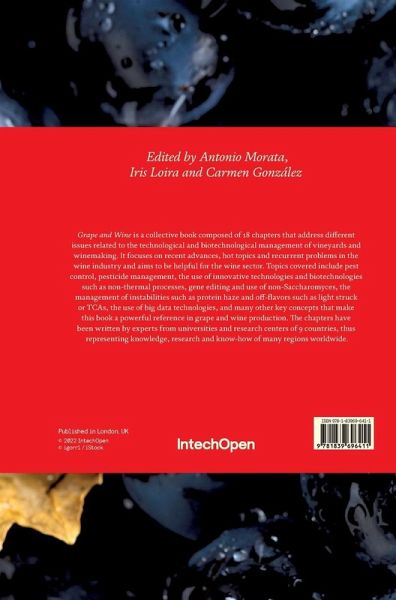 Grape and Wine is a collective book composed of 18 chapters that address different issues related to the technological and biotechnological management of vineyards and winemaking. It focuses on recent advances, hot topics and recurrent problems in the wine industry and aims to be helpful for the wine sector. Topics covered include pest control, pesticide management, the use of innovative technologies and biotechnologies such as non-thermal processes, gene editing and use of non-Saccharomyces, the management of instabilities such as protein haze and off-flavors such as light struck or TCAs, the use of big data technologies, and many other key concepts that make this book a powerful reference in grape and wine production. The chapters have been written by experts from universities and research centers of 9 countries, thus representing knowledge, research and know-how of many regions worldwide.