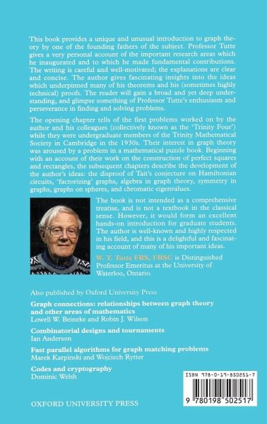 This book provides a unique and unusual introduction to graph theory by one of the founding fathers, and will be of interest to all researchers in the subject. It is not intended as a comprehensive treatise, but rather as an account of those parts of the theory that have been of special interest to the author. Professor Tutte details his experience in the area, and provides a fascinating insight into how he was led to his theorems and the proofs he used. As well as being of historical interest it provides a useful starting point for research, with references to further suggested books as well as the original papers. The book starts by detailing the first problems worked on by Professor Tutte and his colleagues during his days as an undergraduate member of the Trinity Mathematical Society in Cambridge. It covers subjects such as comnbinatorial problems in chess, the algebraicization of graph theory, reconstruction of graphs, and the chromatic eigenvalues. In each case fascinating historical and biographical information about the author's research is provided.