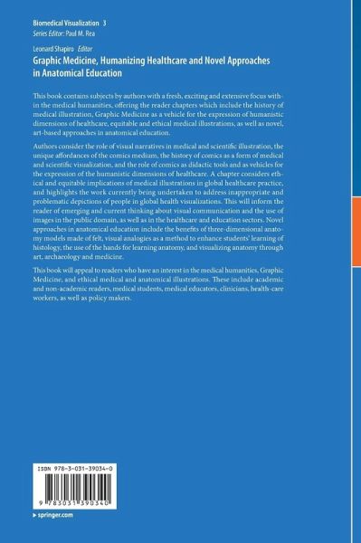 Authors consider the role of visual narratives in medical and scientific illustration, the unique affordances of the comics medium, the history of comics as a form of medical and scientific visualization, and the role of comics as didactic tools and as vehicles for the expression of the humanistic dimensions of healthcare. A chapter considers ethical and equitable implications in global healthcare practice, and highlights the work currently being undertaken to address inappropriate and problematic depictions of people in global health visualizations. This will inform the reader of emergingand current thinking about visual communication and the use of images in the public domain, as well as in the healthcare and education sectors. Novel approaches in anatomical education include the benefits of three-dimensional anatomy models made of felt, visual analogies as a method to enhance students' learning of histology, the use of the hands for learning anatomy, and visualizing anatomy through art, archaeology and medicine.