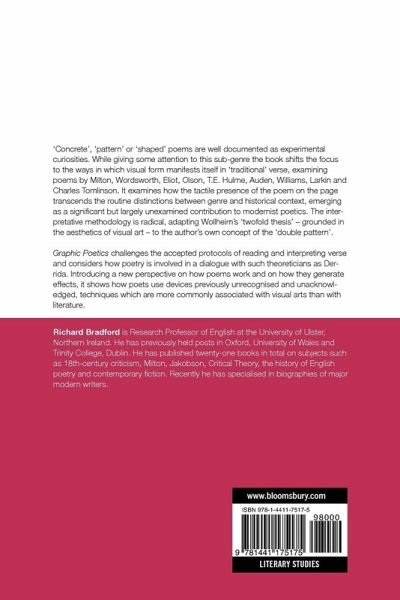 'Concrete', 'pattern' or 'shaped' poems are well documented as experimental curiosities. While giving some attention to this sub-genre the book shifts the focus to the ways in which visual form manifests itself in 'traditional' verse, examining poems by Milton, Wordsworth, Eliot, Olson, T.E. Hulme, Auden, Williams, Larkin and Charles Tomlinson. It examines how the tactile presence of the poem on the page transcends the routine distinctions between genre and historical context, emerging as a significant but largely unexamined contribution to modernist poetics. The interpretative methodology is radical, adapting Wollheim's 'twofold thesis' - grounded in the aesthetics of visual art - to the author's own concept of the 'double pattern'. Graphic Poetics challenges the accepted protocols of reading and interpreting verse and considers how poetry is involved in a dialogue with such theoreticians as Derrida. Introducing a new perspective on how poems work and on how they generate effects, it shows how poets use devices previously unrecognised and unacknowledged, techniques which are more commonly associated with visual arts than with literature.