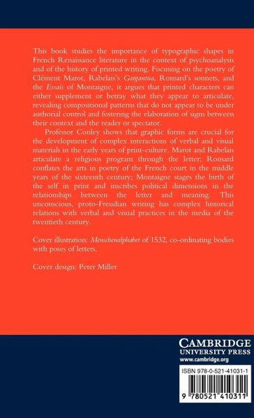 This 1992 book studies the importance of typographic shapes in French Renaissance literature in the context of psychoanalysis and of the history of printed writing. Focusing on the poetry of Clement Marot, Rabelais's Gargantua, Ronsard's sonnets and the Essais of Montaigne, it argues that printed characters can either supplement or betray what they appear to articulate, revealing compositional patterns that do not appear to be under authorial control. Professor Conley shows that graphic forms are crucial for the development of complex interactions of verbal and visual materials in the early years of print culture. Marot and Rabelais articulate a religious programme through the letter; Ronsard conflates the arts in poetry of the French court in the middle years of the sixteenth century; Montaigne stages the birth of the self in print and inscribes political dimensions in the relationship between the letter and meaning. This unconscious, proto-Freudian writing has complex historical relations with verbal and visual practices in the media of the twentieth century.