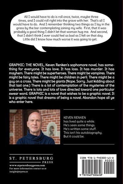Keven Renken's sophomore novel, has something for everyone. It has love. It has loss. It has murder. It has mayhem. There might be superheroes. There might be vampires. There might be fairy tales. There might be children in peril. There might be a guy on a cross. There might be giants (Nope. Sorry. Just kidding about that last one.) There is a lot of contemplation of the mysteries of the universe. There is lots and lots of love directed toward one particular swear word. GRAPHIC is a novel that wishes to be a graphic novel. It is a graphic novel that dreams of being a novel. Abandon hope all ye who enter here.