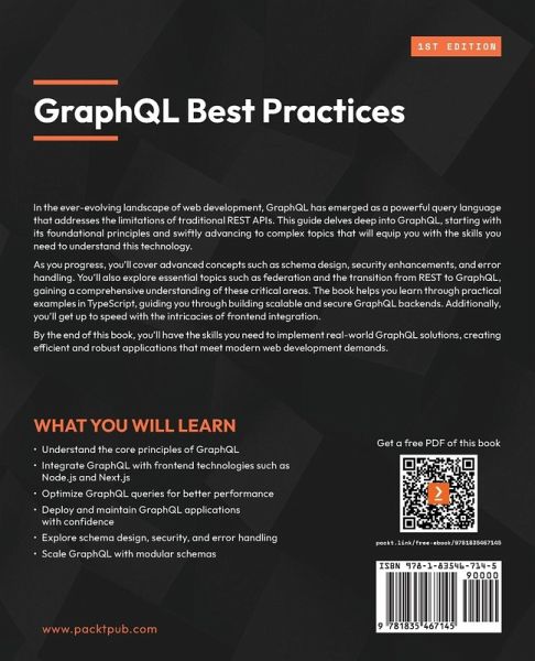 Get to grips with best practices, advanced techniques, and practical examples in TypeScript for building a scalable and secure backend with seamless frontend integration Key Features: - Gain detailed guidance for crafting effective GraphQL schemas - Explore insights into securing and optimizing GraphQL applications - Learn through step-by-step examples, using TypeScript for practical learning - Purchase of the print or Kindle book includes a free PDF eBook Book Description: In the ever-evolving landscape of web development, GraphQL has emerged as a powerful query language that addresses the limitations of traditional REST APIs. This guide delves deep into GraphQL, starting with its foundational principles and swiftly advancing to complex topics that will equip you with the skills you need to understand this technology. As you progress, you'll cover advanced concepts such as schema design, security enhancements, and error handling. You'll also explore essential topics such as federation and the transition from REST to GraphQL, gaining a comprehensive understanding of these critical areas. The book helps you learn through practical examples in TypeScript, guiding you through building scalable and secure GraphQL backends. Additionally, you'll get up to speed with the intricacies of frontend integration. By the end of this book, you'll have the skills you need to implement real-world GraphQL solutions, creating efficient and robust applications that meet modern web development demands. What You Will Learn: - Understand the core principles of GraphQL - Integrate GraphQL with frontend technologies such as Node.js and Next.js - Optimize GraphQL queries for better performance - Deploy and maintain GraphQL applications with confidence - Explore schema design, security, and error handling - Scale GraphQL with modular schemas Who this book is for: This book is for developers interested in advancing their knowledge of GraphQL, from beginners curious about the basics to experienced developers looking to refine their schema design and security strategies. It's particularly ideal for backend developers, full-stack professionals, and frontend developers who wish to understand GraphQL from the ground up and apply advanced techniques in real-world scenarios. Additionally, this book is a must-read for anyone looking to make their applications more efficient and robust using GraphQL. Table of Contents - Unveiling the Holy Grail of Communication - GraphQL - Applying an AI-Friendly Approach to GraphQL - Crafting Effective GraphQL Schemas - Building Pipes - Transitioning from REST to GraphQL - Defining GraphQL Transformers - Understanding GraphQL Federation - Executing Schema-First Systems - Working on the Frontend with GraphQL - Keeping Data Secure - Describing Errors in GraphQL - Documenting your Schema - Tackling Schemas with Visualization - From an Idea to a Working Project - Backend Development with GraphQL and TypeScript - From an Idea to a Working Project - Frontend Integration with GraphQL and TypeScript