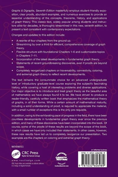 Graphs & Digraphs, Seventh Edition masterfully employs student-friendly exposition, clear proofs, abundant examples, and numerous exercises to provide an essential understanding of the concepts, theorems, history, and applications of graph theory. This classic text, widely popular among students and instructors alike for decades, is thoroughly streamlined in this new, seventh edition, to present a text consistent with contemporary expectations.