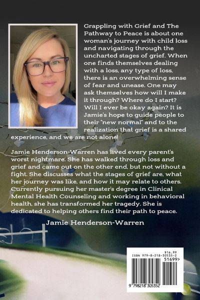 Grappling with Grief and The Pathway to Peace is about one woman's journey with child loss and navigating through the uncharted stages of grief. When one finds themselves dealing with a loss, any type of loss, there is an overwhelming sense of fear and unease. One may ask themselves how will I make it through? Where do I start? Will I ever be okay again? It is Jamie's hope to guide people to their "new normal" and to the realization that grief is a shared experience, and we are not alone! At the end of the book there are guided reflection questions to help you with your grief and a section to take notes on to reflect at a later time. Jamie Henderson-Warren has lived every parent's worst nightmare. She has walked through loss and grief and came out on the other end, but not without a fight. She discusses what the stages of grief are, what her journey was like, and how it may relate to others. Currently pursuing her master's degree in Clinical Mental Health Counseling and working in behavioral health, she has transformed her tragedy. She is dedicated to helping others find their path to peace.